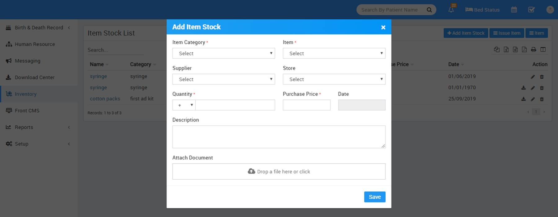 - To add item stock click on + Add Item Stock button, here enter Item Category, Item Name, Supplier, Store, Quantity, Purchase Price, Date, Description and Attach Document.