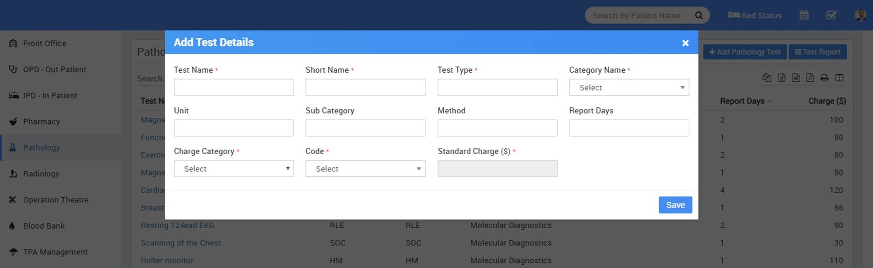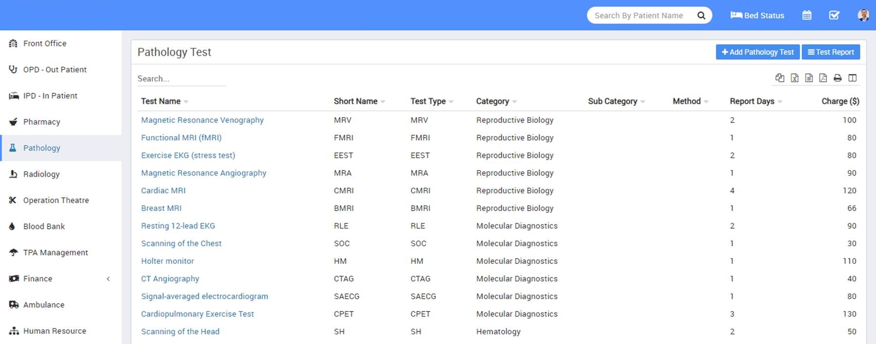• To add pathology test click on + Add Pathology Test button here enter Test Name, Short Name, Test Type, Category Name, Unit, Sub Category, Method, Report Days, Charge Category, Code, Standard Charge here charge category and code will come from hospital charges investigation charge type. Added pathology test will be list on pathology test page.