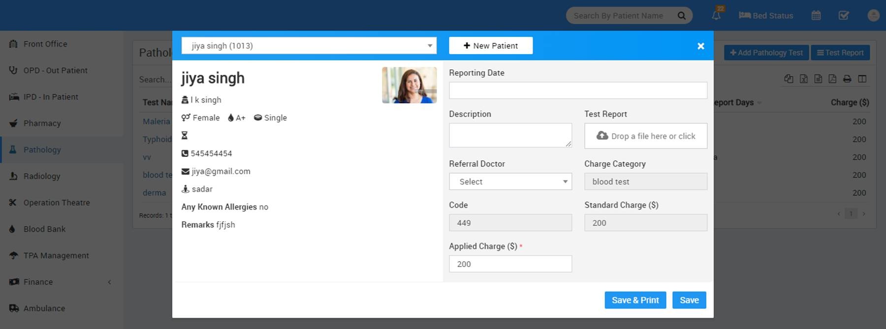 • To enter patient test report for a pathology test click on + Add Patient & Report icon button. Here select Patient Name from dropdown or click on + New Patient button to add new patient then enter Reporting Date, Description, Test Report, Referral Doctor. Remaining field like Charge Category, Code, Standard Charge($), Applied Charge($) will automatically add, which has been set in Hospital Charge. Click on Save.