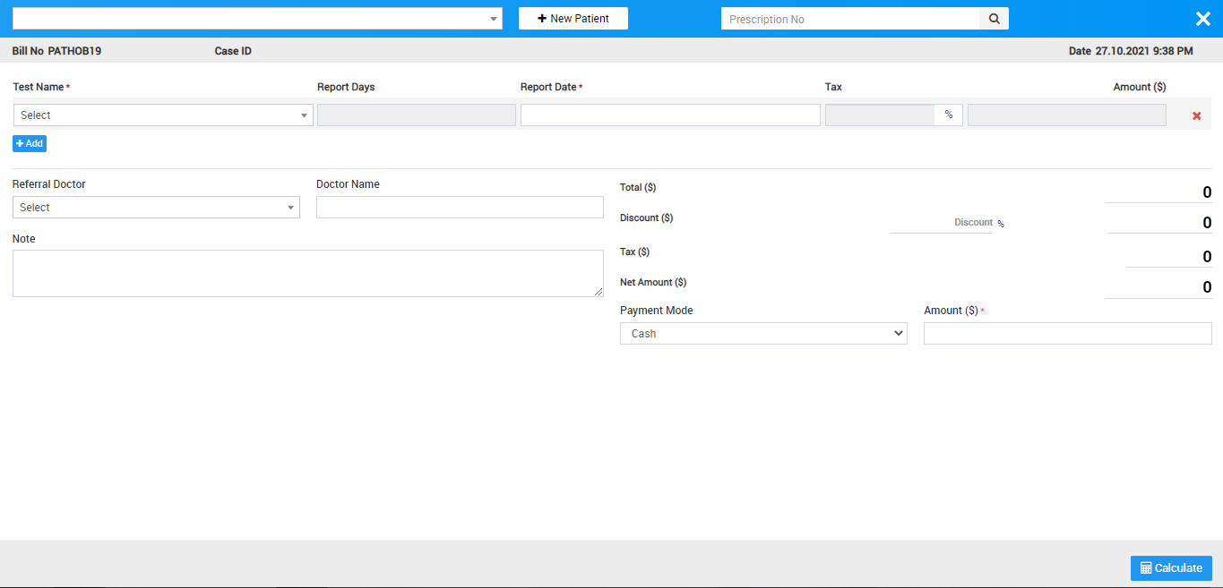 3. Enter Prescription No. so patient details with prescribed test will auto fill at generate bill), Test Name, Reports Days, Report Date, Tax, Amount, Hospital Doctor and Doctor Name, custom field details (if any) then after adding all pathology test details enter Discount and Tax if any, to calculate final bill click on Calculate button then click on Save button. After this,  bill will be displayed on Pathology page.