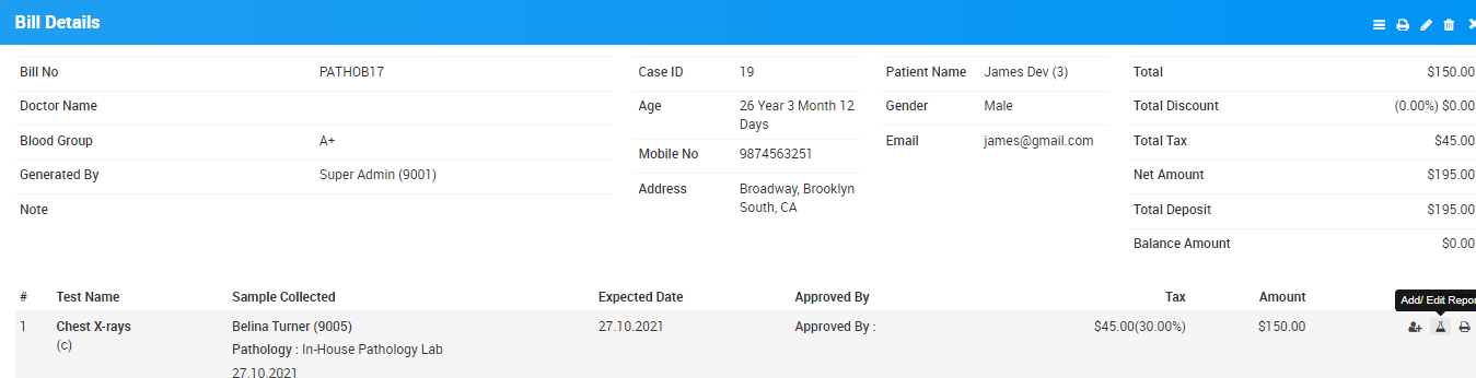 Once you have added Collection Person details and click on Save button so you will see one more option at bill detail page which is Add/Edit Report from this option radiologist/staff can add patient test result report.