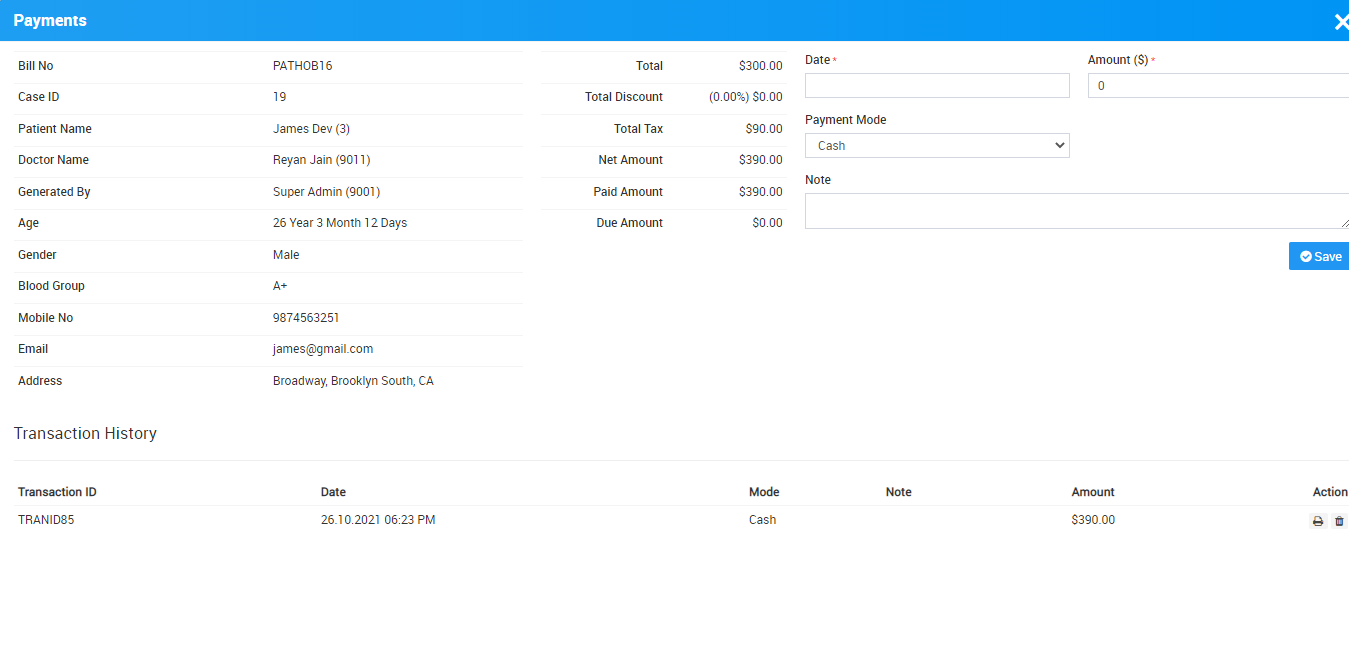 To Add/View patient payment of Pathology Test go to Pathology > Add/View Payments. Here enter payment details like payment Date, Amount, Payment Mode, Note and then click on Save button.