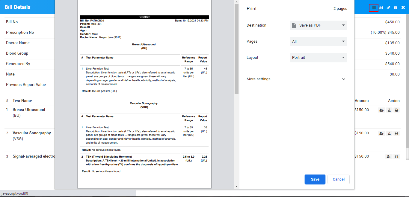 Now to print Pathology Test report click on Print button present at Action column at Test details under View Report page.