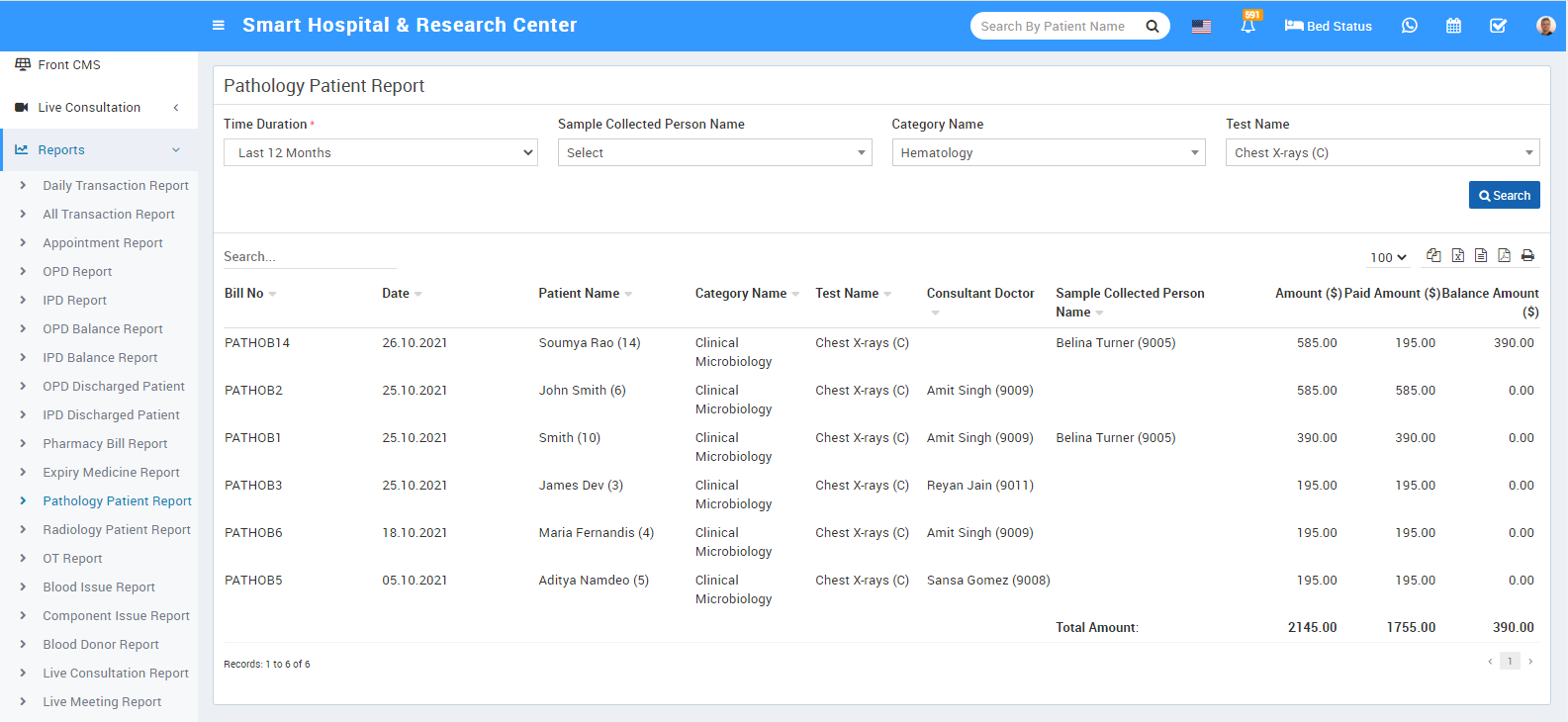 To check Pathology Patient report, go to Reports > Pathology Patient Report. Here select the Time Duration, Sample Collected Person Name, Category Name and Test Name then click on Search button. Here you can see patient pathology details like Bill No, Patient Name, Test Name, Consultant Doctor, Sample Collected Person Name, Amount, Paid Amount, Balance Amount etc. Also you can download this report as PDF.