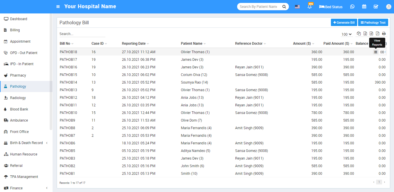 Now after generate pathology bill there two option will be show these are View Reports and Add/View Payment.