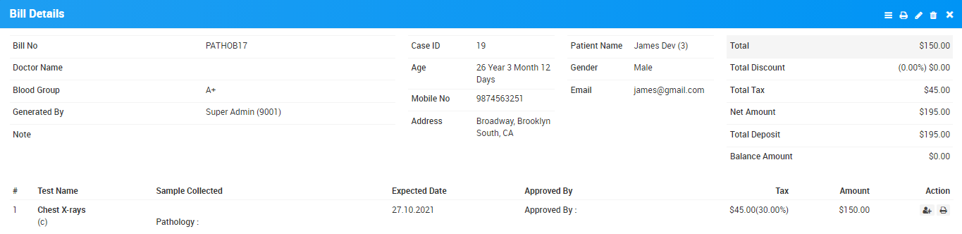 There is one more section at Bill Details under test details section where you can add/edit Sample Collection Person details and Print Report.