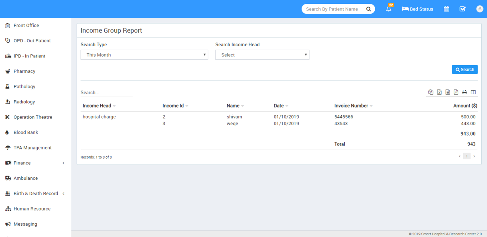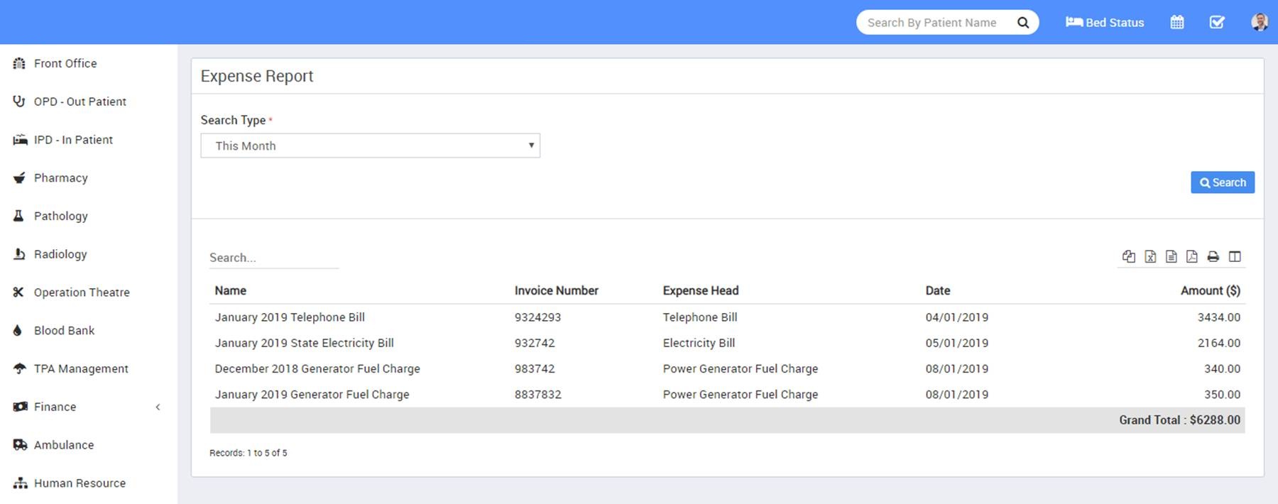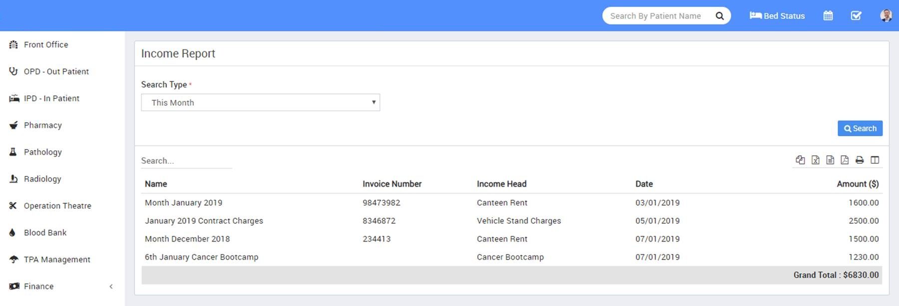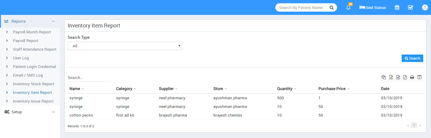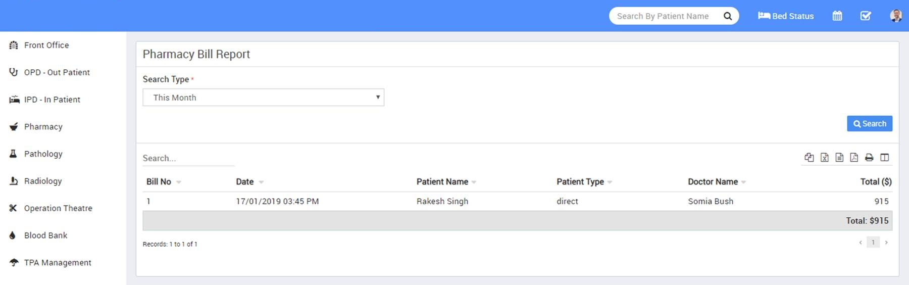 - Pharmacy Bill Report – Here in search type you can select different time intervals for report data. Also you can download this report as PDF.