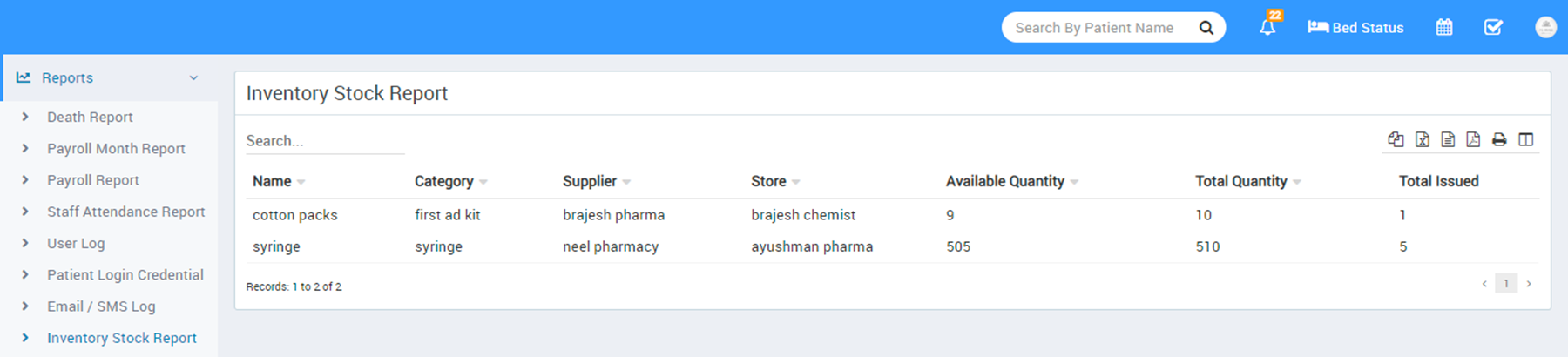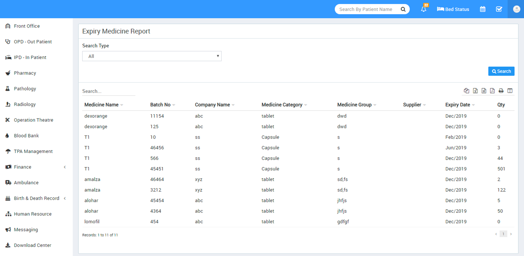 - Expiry Medicine Report – Here in search type you can select different time intervals for report data. Also you can download this report as PDF.