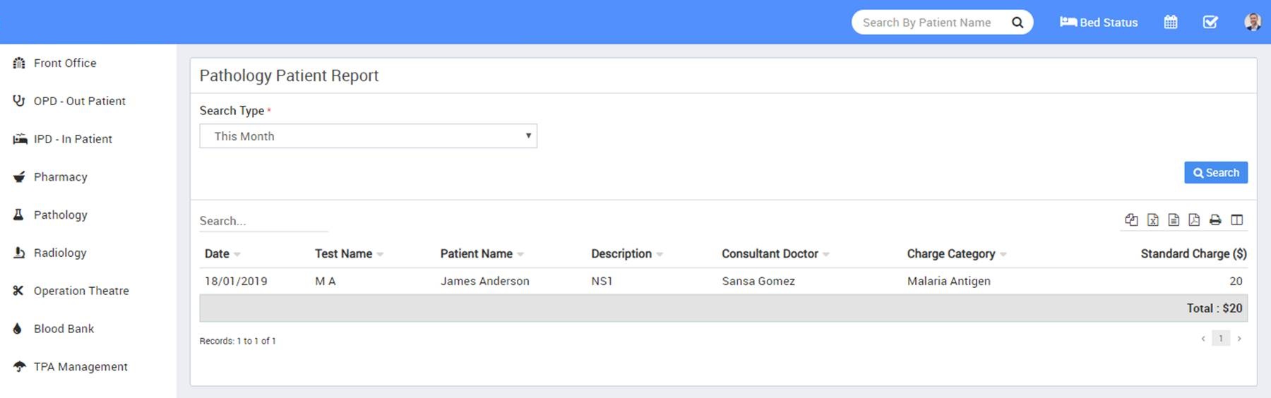 - Pathology Patient Report – Here in search type you can select different time intervals for report data. Also you can download this report as PDF.