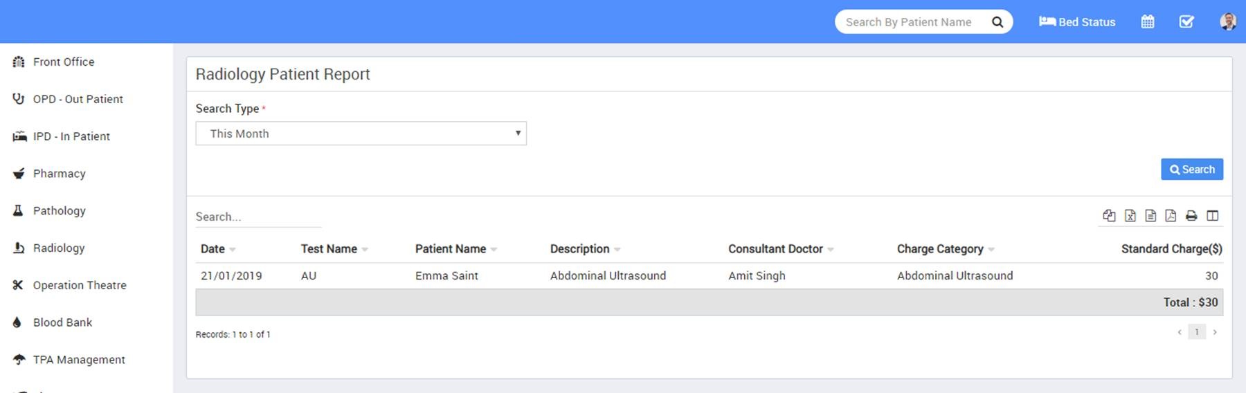 - Radiology Patient Report – Here in search type you can select different time intervals for report data. Also you can download this report as PDF.
