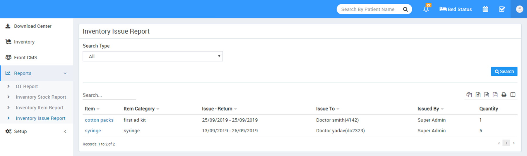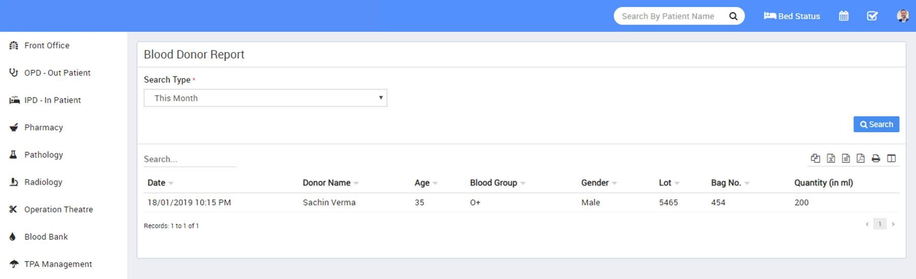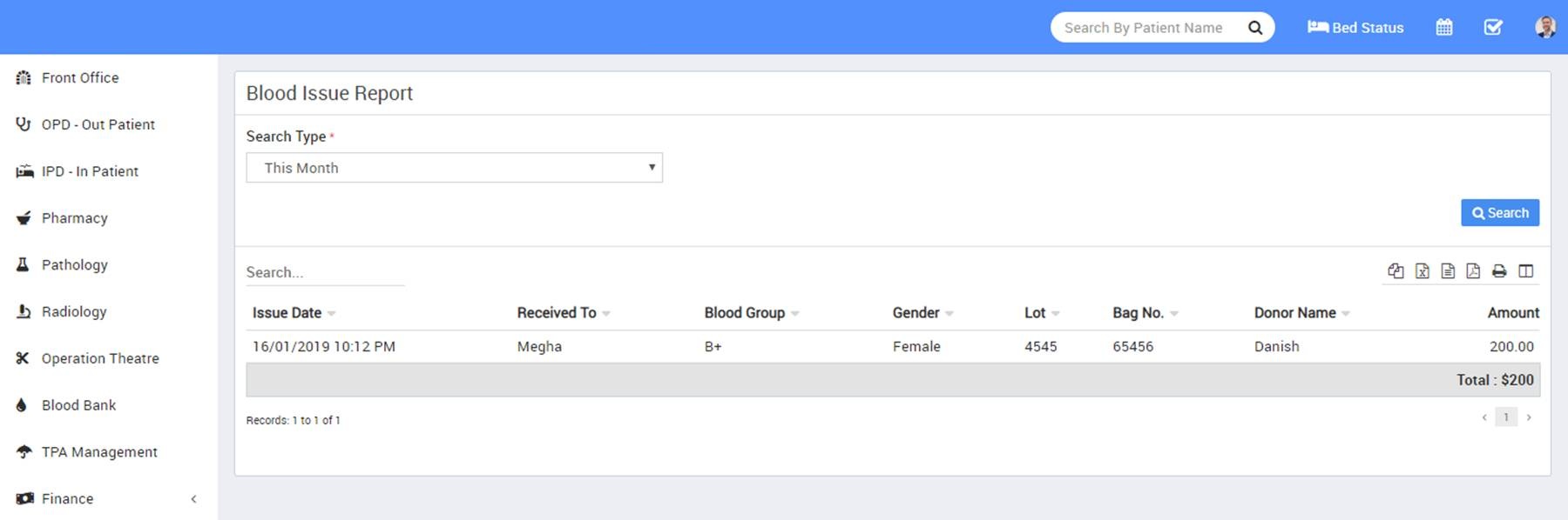 - Blood Issue Report – Here in search type you can select different time intervals for report data. Also you can download this report as PDF.