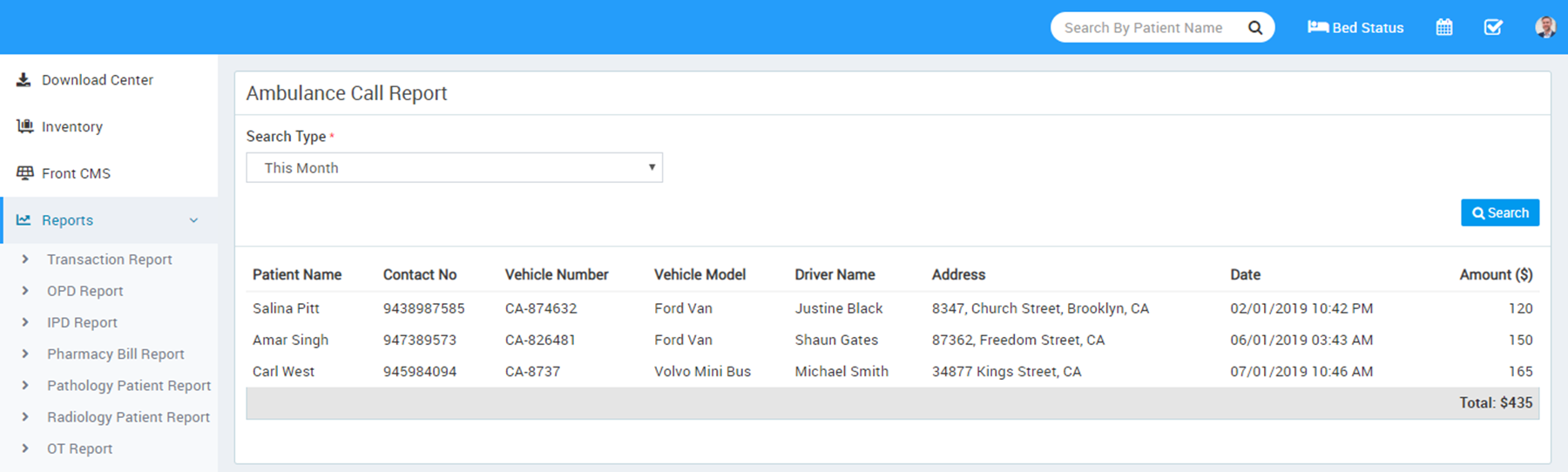 - Ambulance Report – Here in search type you can select different time intervals for report data. Also you can download this report as PDF.