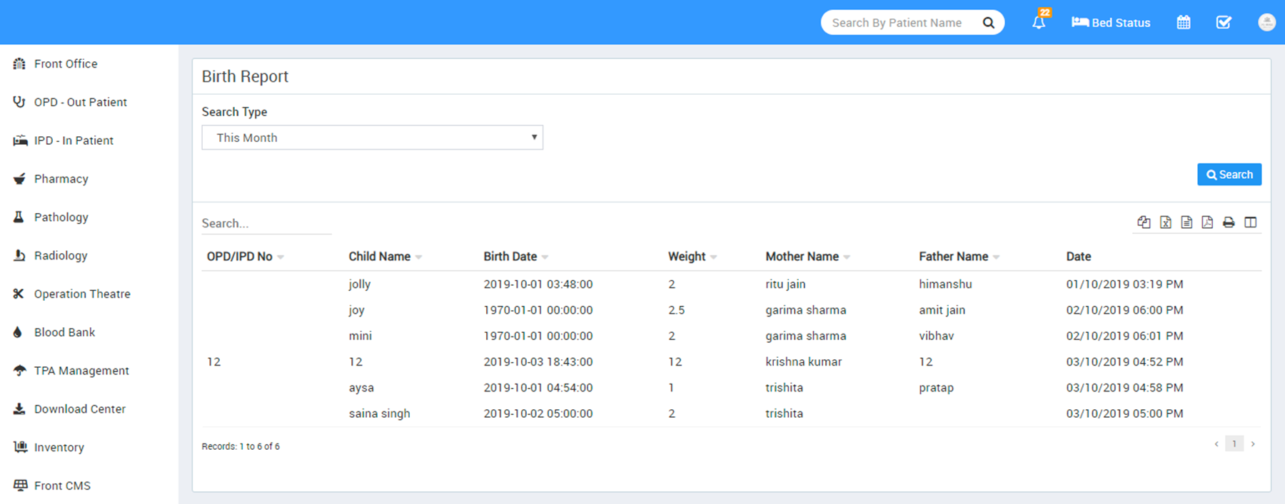 - Birth Report – Here in search type you can select different time intervals for report data. Also you can download this report as PDF.