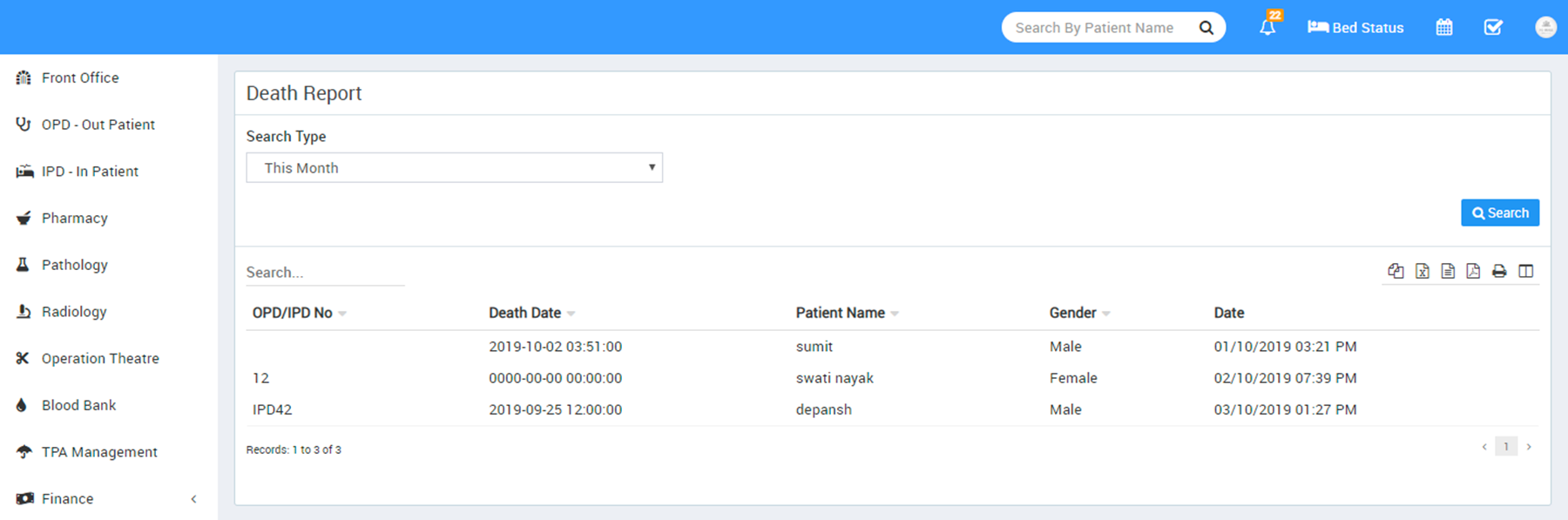 - Death Report – Here in search type you can select different time intervals for report data. Also you can download this report as PDF.