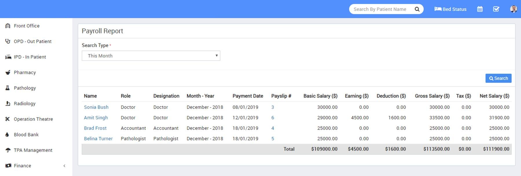 - Payroll Report – Here in search type you can select different time intervals for report data. Also you can download this report as PDF.